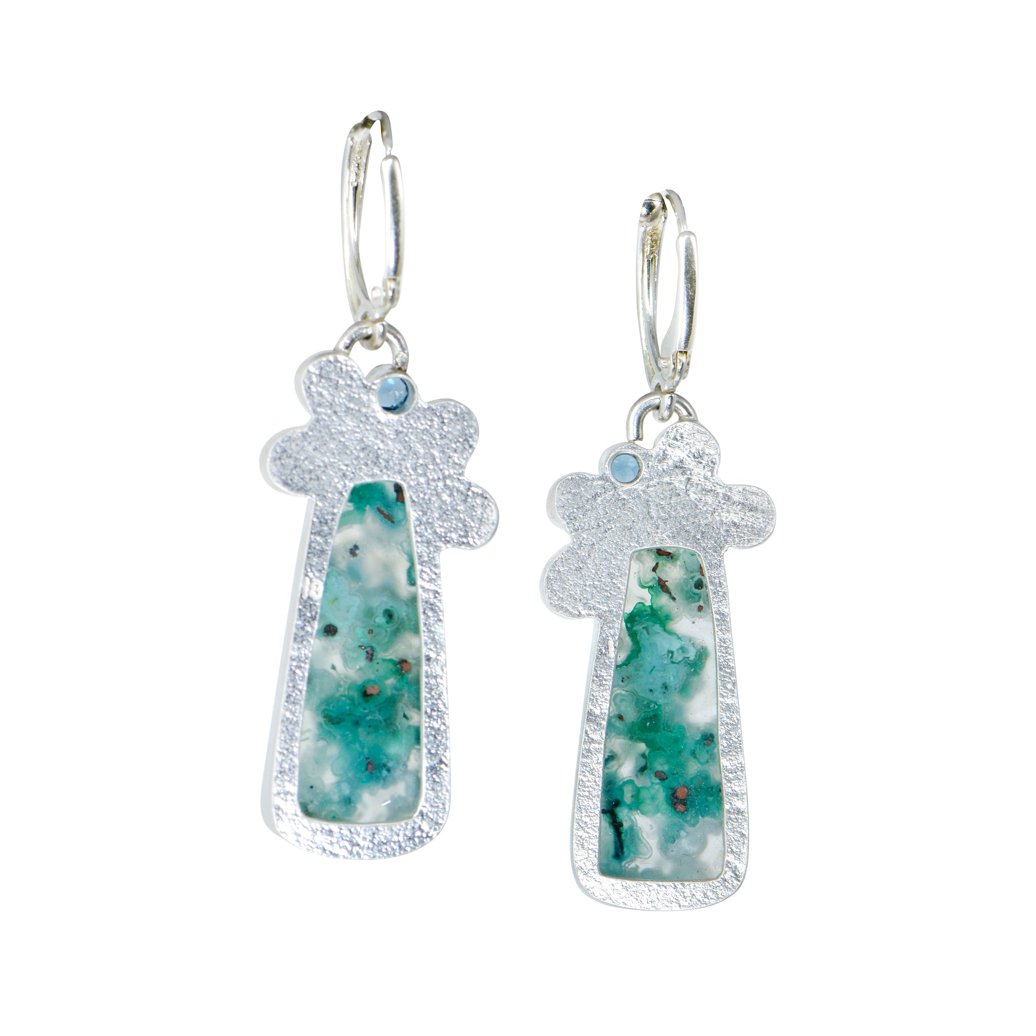 Fun and playful, these Confetti Chrysocolla earrings have lots of greens and blues with London blue topaz to accent. Hand constructed of Argentium Sterling with a 18k accents.Sterling Leverbacks