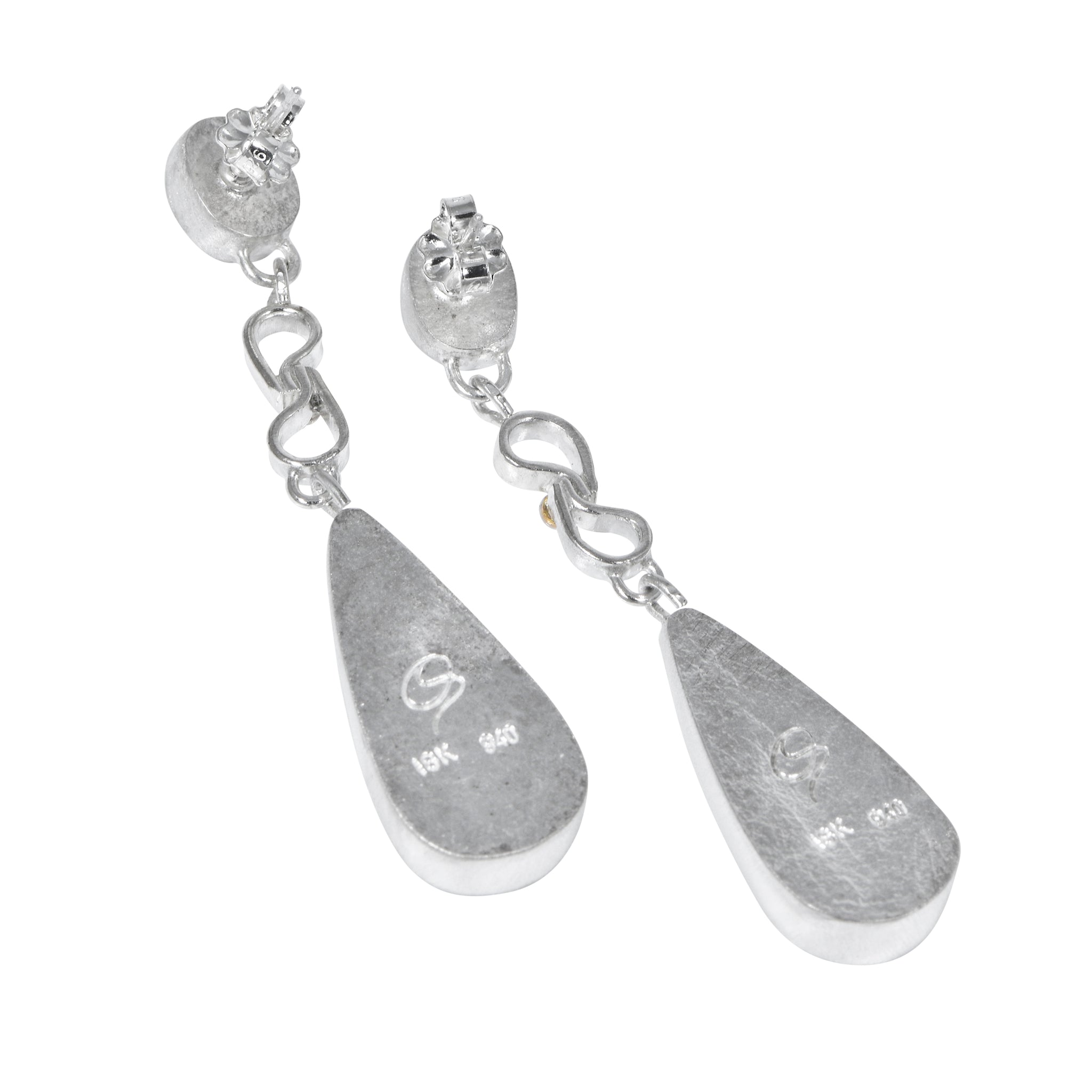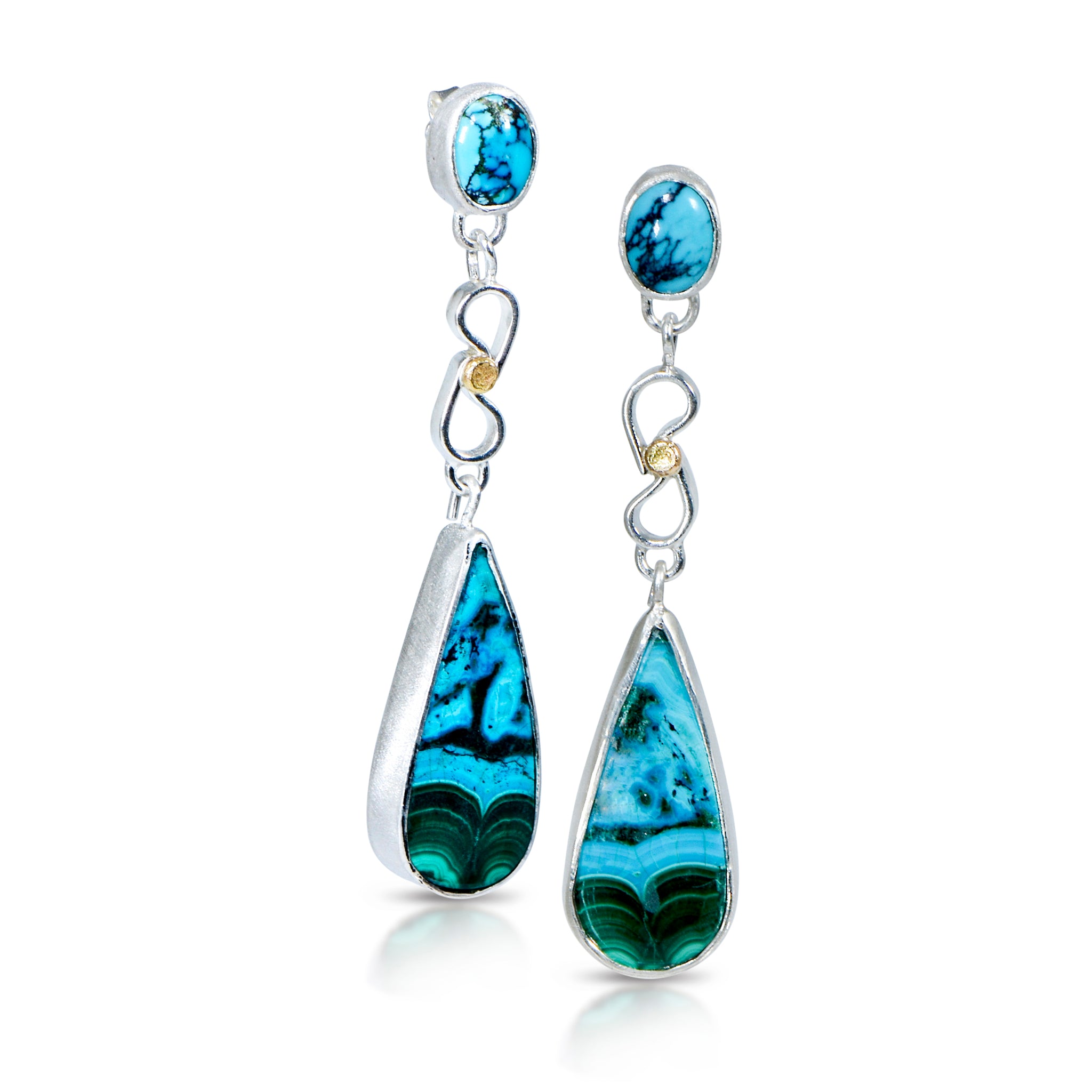 Fun drop earrings with lots of movement featuring a unique three-part design. At the top are oval shaped turquoise stones, connected by argentium droplets incorporating an 18k gold accent in the center. The earrings culminate in a teardrop-shaped Chrysocolla/Malachite stone, adding lots of swirling color. The combination of color and movement create a sophisticated and fun addition to any outfit.