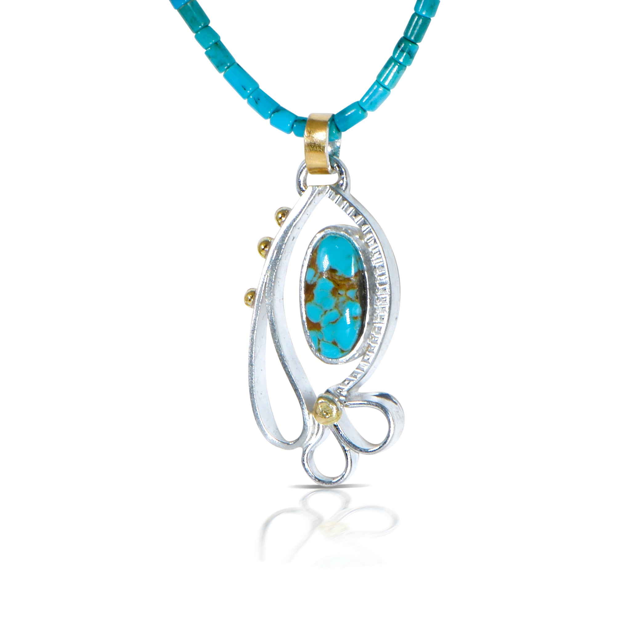 Kingman turquoise, from Arizona, is framed with Argentium elements inspired by waterfalls and water drops and accented with 18k gold.. The pendant hangs from a 22kt/sterling bi-metal bail on 18" Kingman turquoise heishi beads.